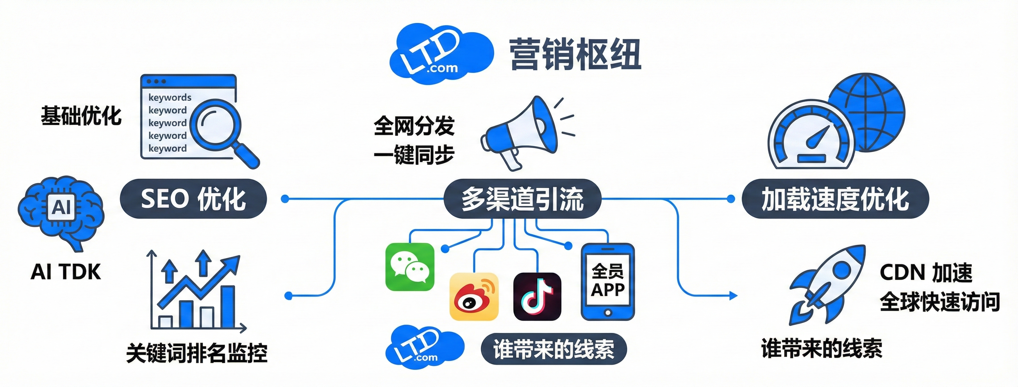 加载速度优化:别让流量跑掉,老网站常因加载慢丢客户,营销枢纽自带 CDN 加速,开启后国外客户也能快速访问。