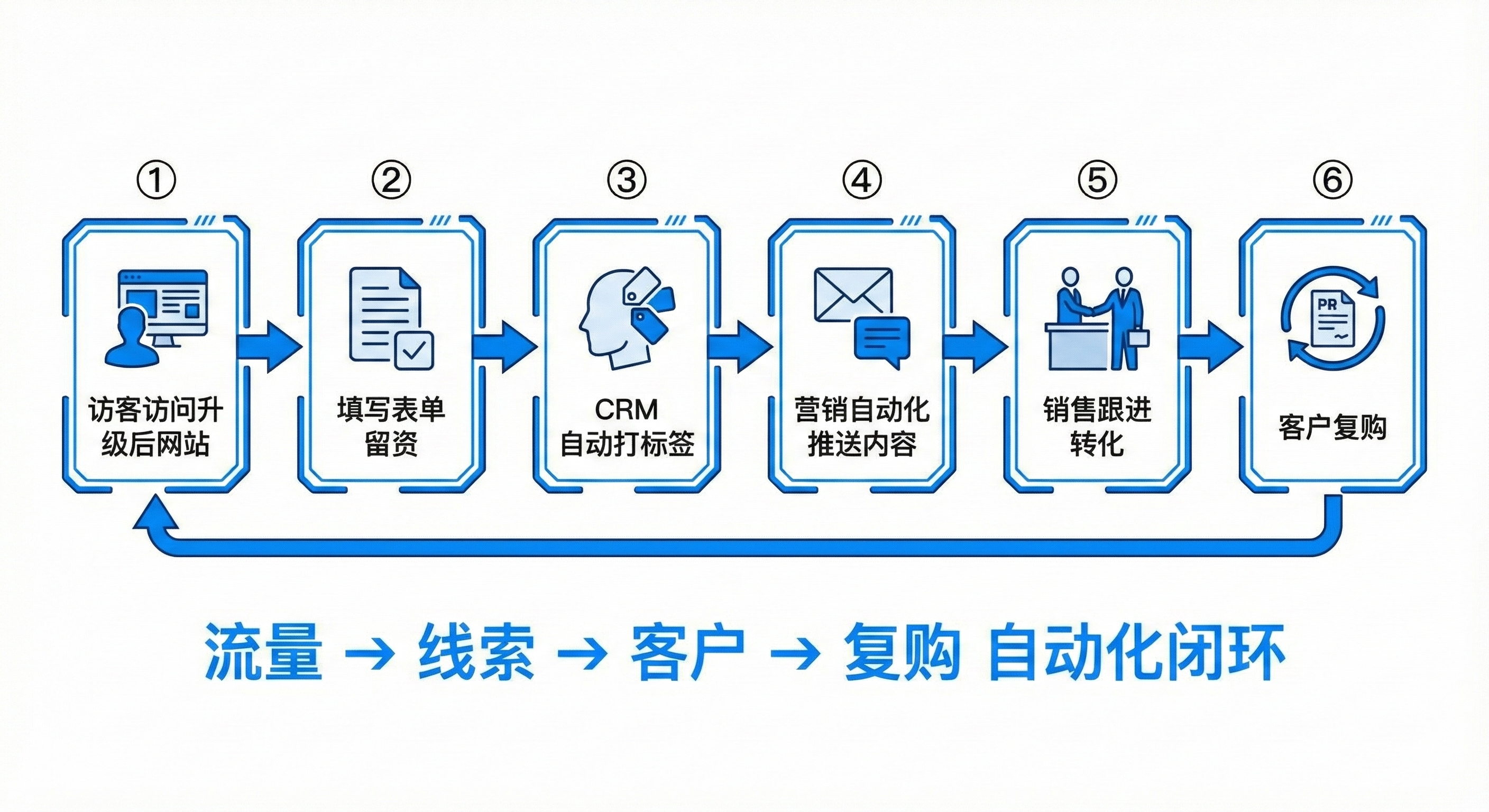数据迁移:把老网站的访客记录、老客户信息(如留言表单、咨询记录)通过批量导入,同步到营销枢纽的 CRM 系统里,避免客户资源流失。